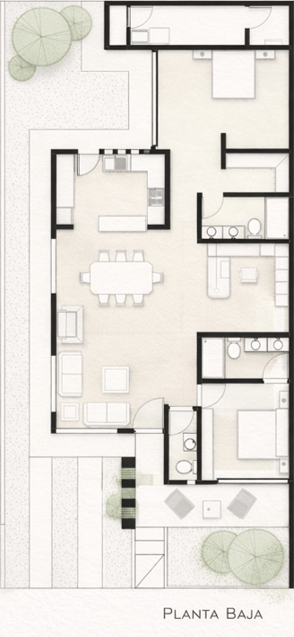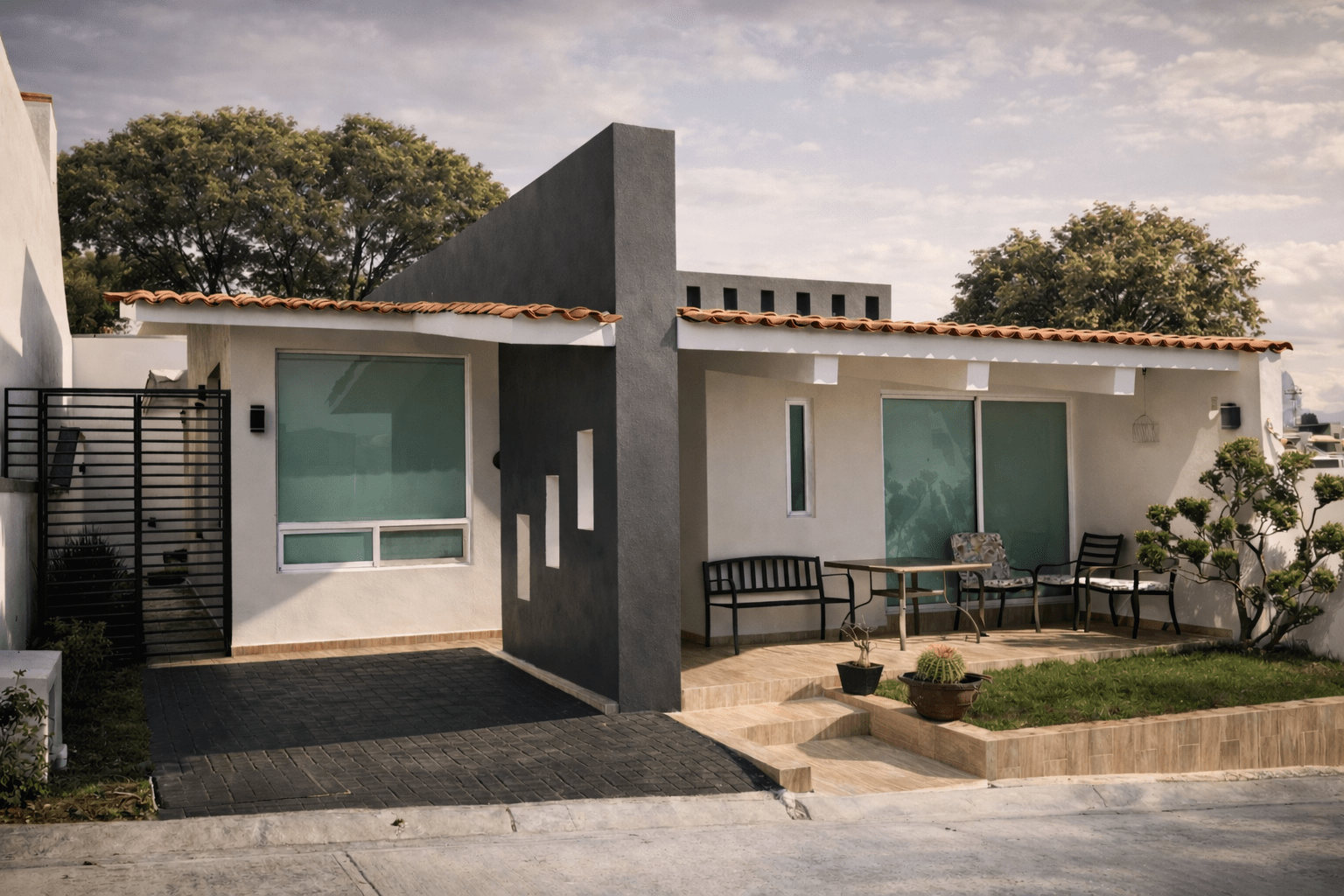 Construcción habitacional de una sola planta que responde a las necesidades y requerimientos particulares del condominio y a las condiciones climáticas del emplazamiento.
